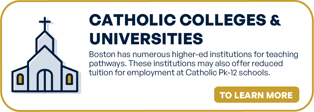 View the Massachusetts colleges and universities in the Greater Boston area below for continuing education opportunities within Catholic, higher educational environments — several of which offer programming at discounted rates for teachers working in Catholic schools.